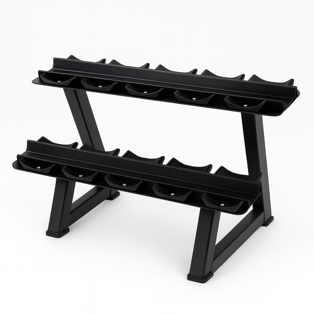 Dit stevige, strak ontworpen rek is geschikt voor 6 paar ronde dumbbells en combineert maximale stabiliteit met een minimalistische uitstraling – perfect voor elke homegym, personal training studio of fitnesscentrum.
