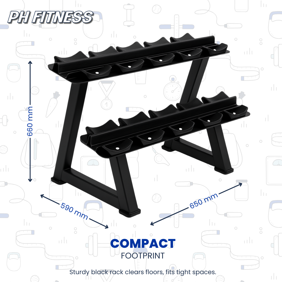 Houd je trainingsruimte georganiseerd en professioneel met het PH Fitness 2-laags dumbbellrek.